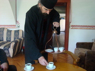 otac Makarije nas posluženje kafom u maloj trpezariji