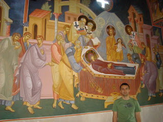 Kafu nismo dugo ispijali, naime o.Makarije nas je pozvao da vidimo novu kapelicu koja se nalazi unutar konaka manastira i koju živopišu trenutno neki poznati ruski umetnici. Nisam mogao odoleti da se ne uslikam pored najlepše i najveće freske Uspenje Presvete Bogorodice.